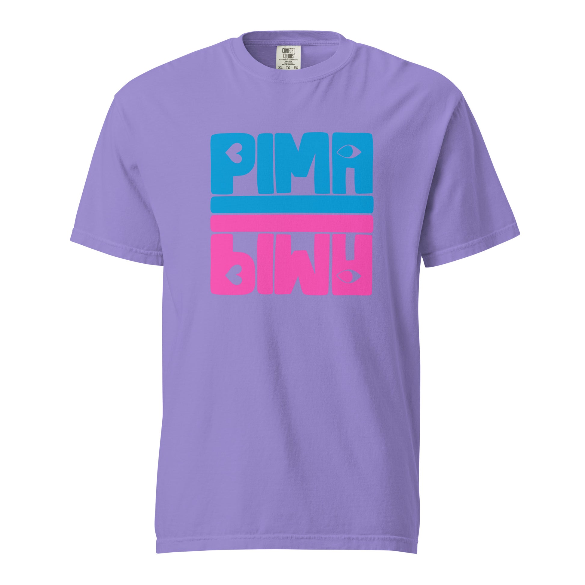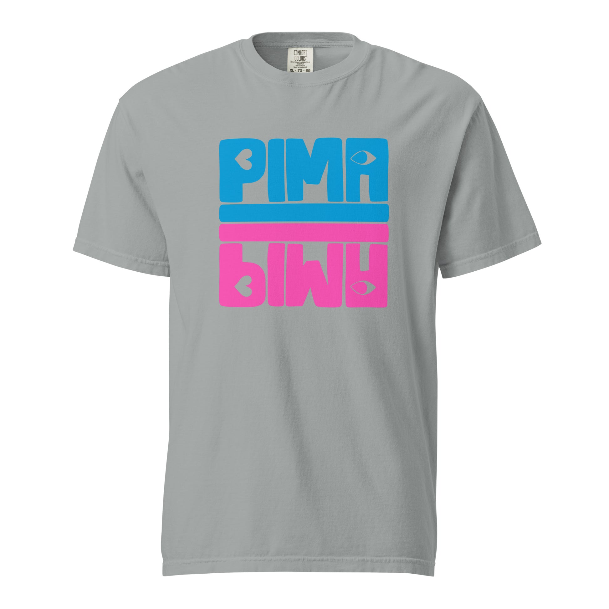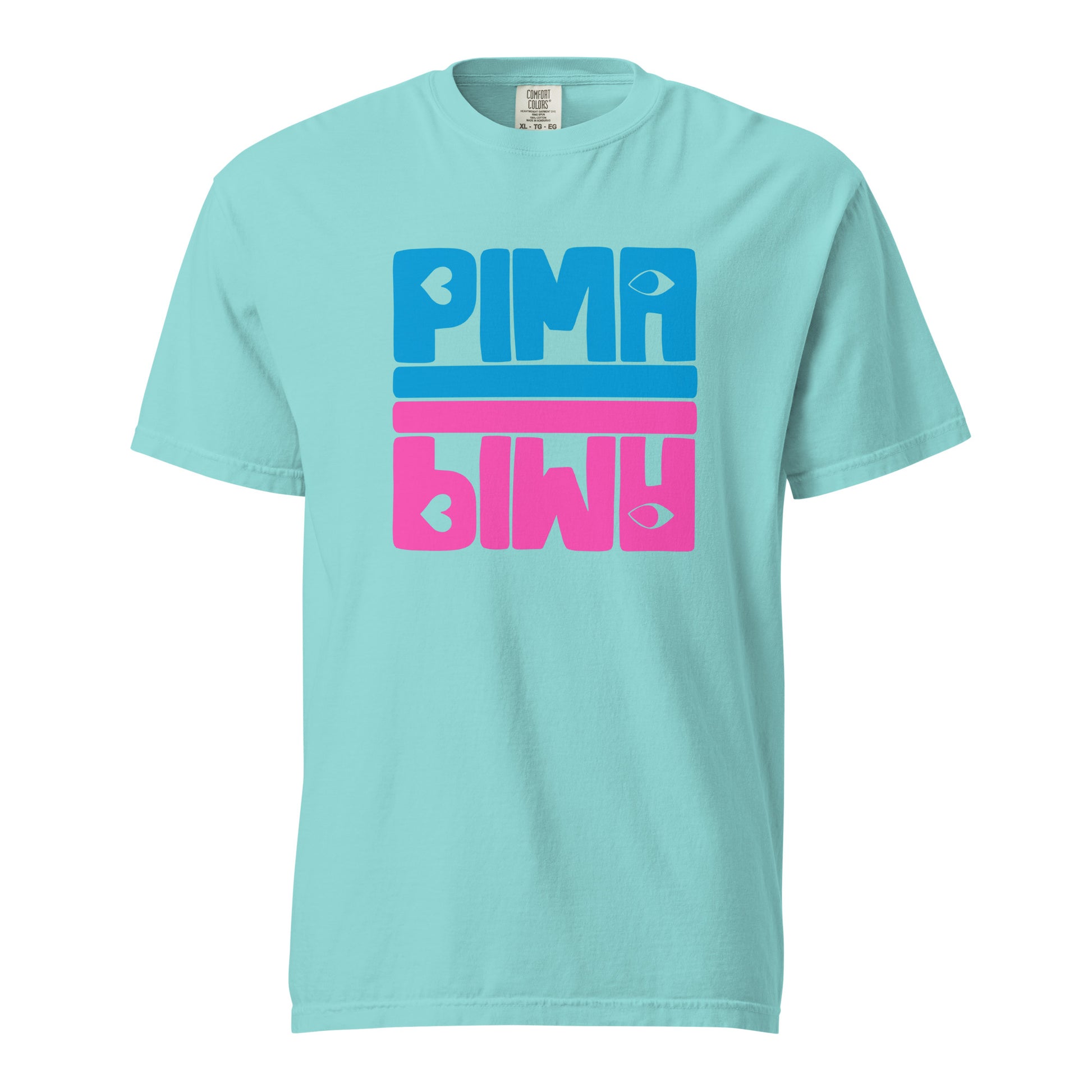 Hellblau-rosa gespiegelter PIMA Schriftzug auf bequemer Baumwolle. Das Design stammt aus einem Linolschnitt.